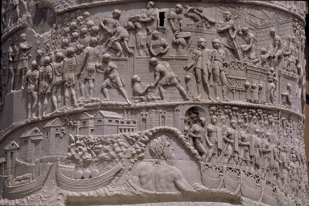 The column stands approximately 30 meters tall and is adorned with a continuous frieze that illustrates the major events of Trajan’s Dacian campaigns. The reliefs are notable for their detailed and dynamic representation of military and ceremonial scenes, offering a vivid portrayal of Roman military tactics and imperial propaganda.