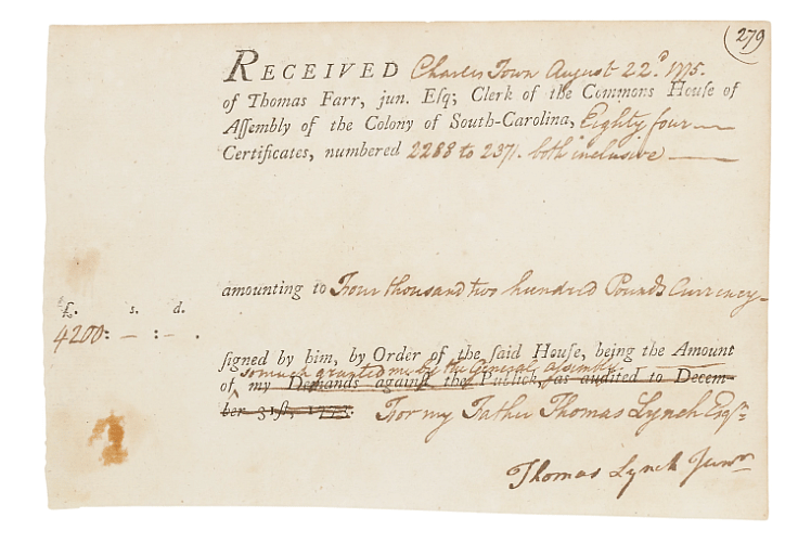 7. Thomas Lynch Jr Declaration Signer 1775, $212,500
