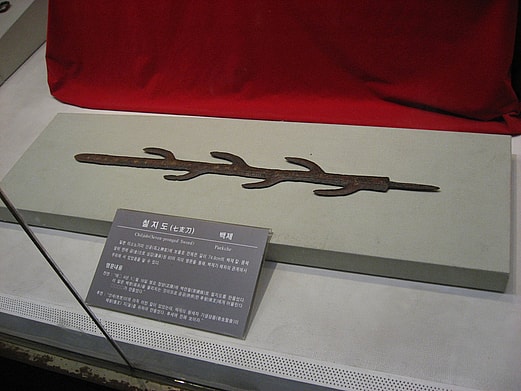 The Seven-branched sword was not used for battle, rather as a ceremonial sword due to its peculiar shape. One each side of the central blade, there are three protrusions that combined with the central blade tip make seven branches of the sword. The blade itself is two and a half feet long and made of iron, with inlaid gold inscriptions on either side of the central blade.