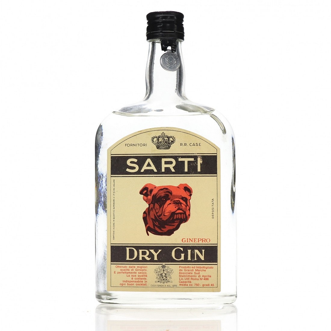 Another gin from the past is our seventh selection, also known as Sarti Dry Gin. The label of the spirit is unforgettable, with a bright red bulldog in the center and a crown at the top. This gin was made for the Italian market in Bologna sometime during the 1950s.