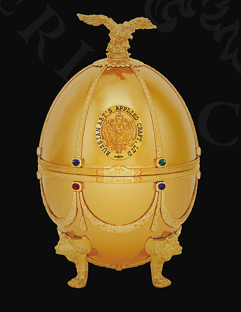 The Decanter and glasses are made of Venetian glass with elegant gilding, with all decorative elements being covered in 24k gold. The gift set includes the decanter of 70/75 cl with four shots, a case in the form of Faberge Easter Egg as well as the gift box. This is a unique case in the form of eggs in a style inspired by the works of Karl Faberge, creating this wonderful collection.