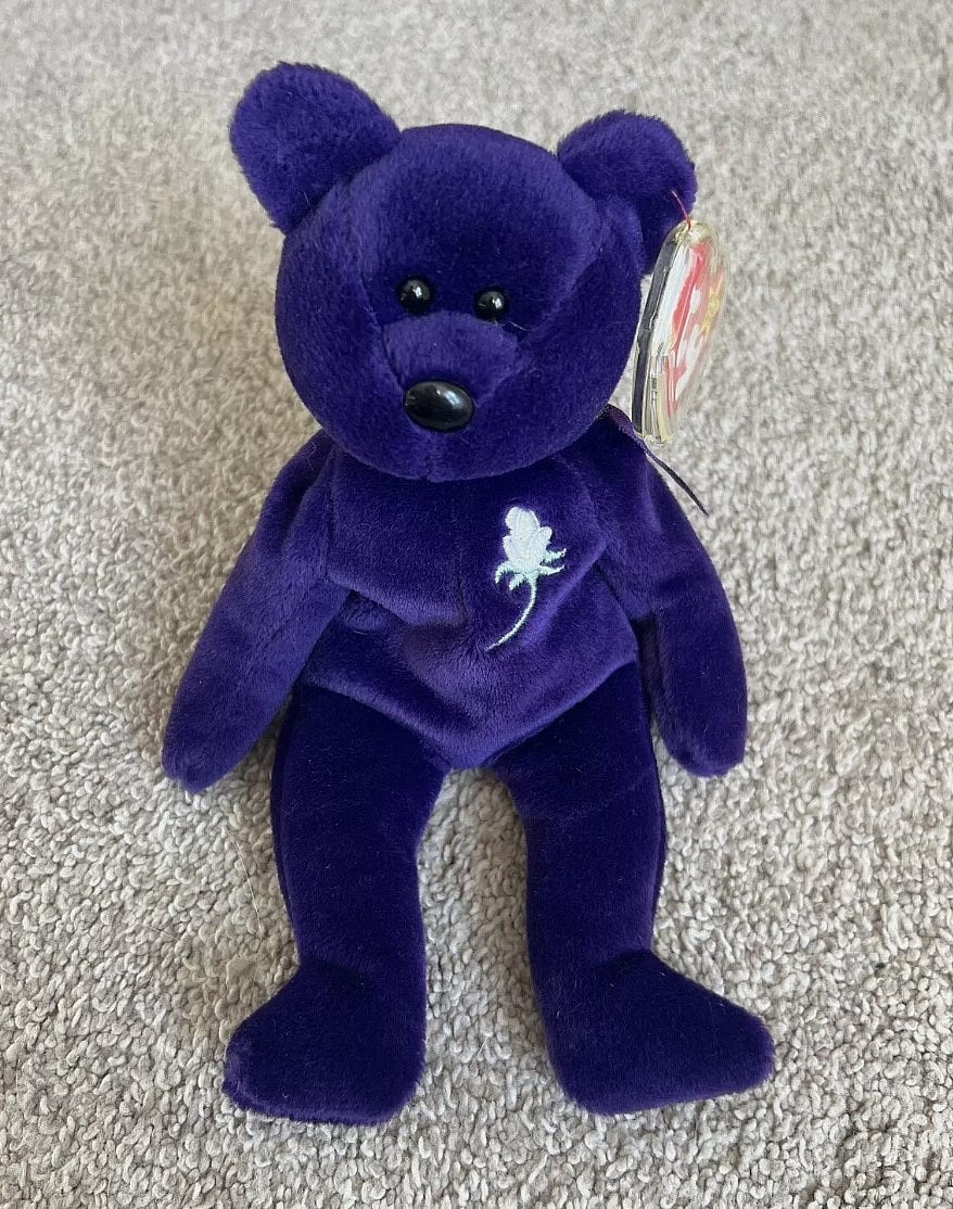 Princess the Bear, also known as Princess Diana Beanie Baby, is the rarest Beanie Babies 2024 thanks to its rarity. The purple bear with a white rose on its chest was sold in December 1997 to benefit the Diana, Princess of Wales memorial fund. It was heavily sought after during its sale since the shipments were limited to just 12 per licensed retailer.