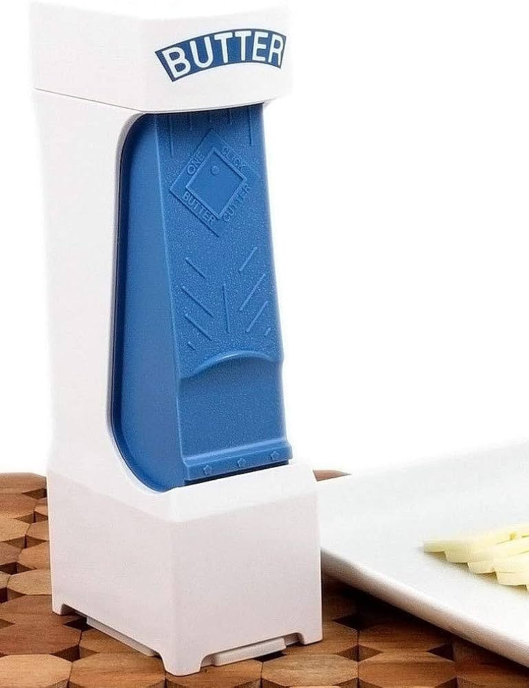 Usually, butter is placed in a glass dish and passed around the table with a knife. Our fourth weird kitchen gadget presents another solution to getting your slab of butter. The One-Click butter cutter is a handheld device that slices butter right onto your food with the press of a button. These don’t work for all sticks of butter though (such as the sticks in California, Oregon, or Washington).