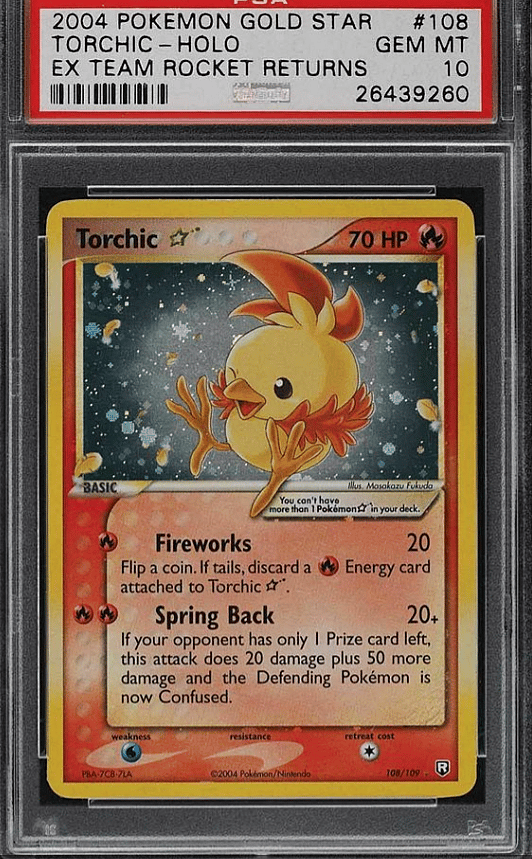 Starting strong, we have the 2004 Gold Star Torchic-Holo edition. The Fire-type Pokemon is lighting the way to the start of the most expensive Pokemon cards ever sold. With a PSA grading of a MINT 10, there’s no doubt this is one of the best finds for Pokemon collectors.