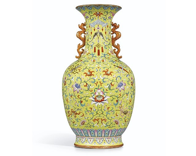 15. Chinese Yellow Famille-Rose Anbaxian Sgraffiato Vase, $6.6 Million