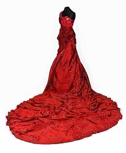 Out of all the most expensive dresses on our list, the Nightingale of Kuala Lumpur takes the cake, valued at $30 million. Released in 2009, the dress was designed by Faisal Abdullah and is made of crimson silk and taffeta, with over 750 diamonds sewn into it. If over 700 diamonds aren’t enough, there is also a 70-carat diamond at its center.