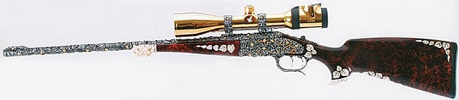 With inlaid gold and hundreds of set diamonds decorating the gun. Along with carved ivory rests and grip.