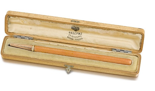 Estimated to be between $8,000 and $11,000, this mechanical pencil has a translucent peachy surface. This pencil is said to be purchased from the London branch of Fabergé by Grand Duke Michael Mikhailovich in 1914 for only 6 pounds, which would have been $7.
