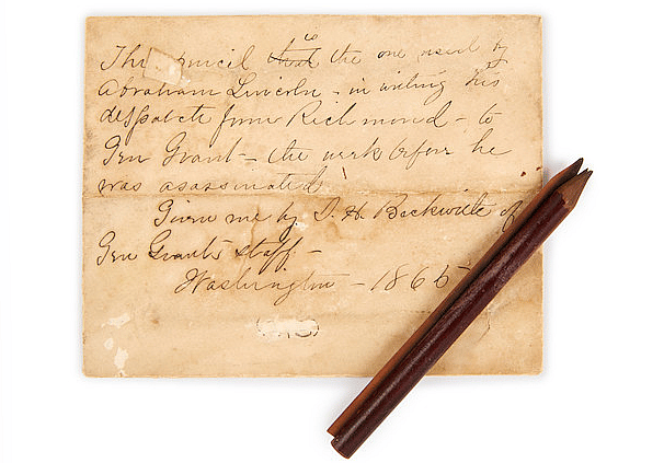 This wooden pencil, however, is said to be the one used by Lincoln when writing his dispatch from Richmond to Gen Grant, the week before he was assassinated. The action for this extravagant pencil took place at Bonhams April 2014 and was sold for over $11,000.