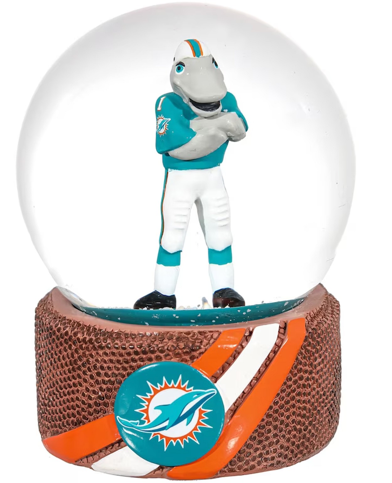 Now, you may have seen T.D. the Miami Dolphins mascot collapse after a set of pushups during their seventy-point win over Denver. Thankfully, T.D. is okay and ready to cheer for his team each Sunday, and you can cheer for him too with a snow globe highlighting this water-loving mascot. My favorite part about this Miami Dolphins collectible is the base of the snow globe, which has a distinct football pattern.