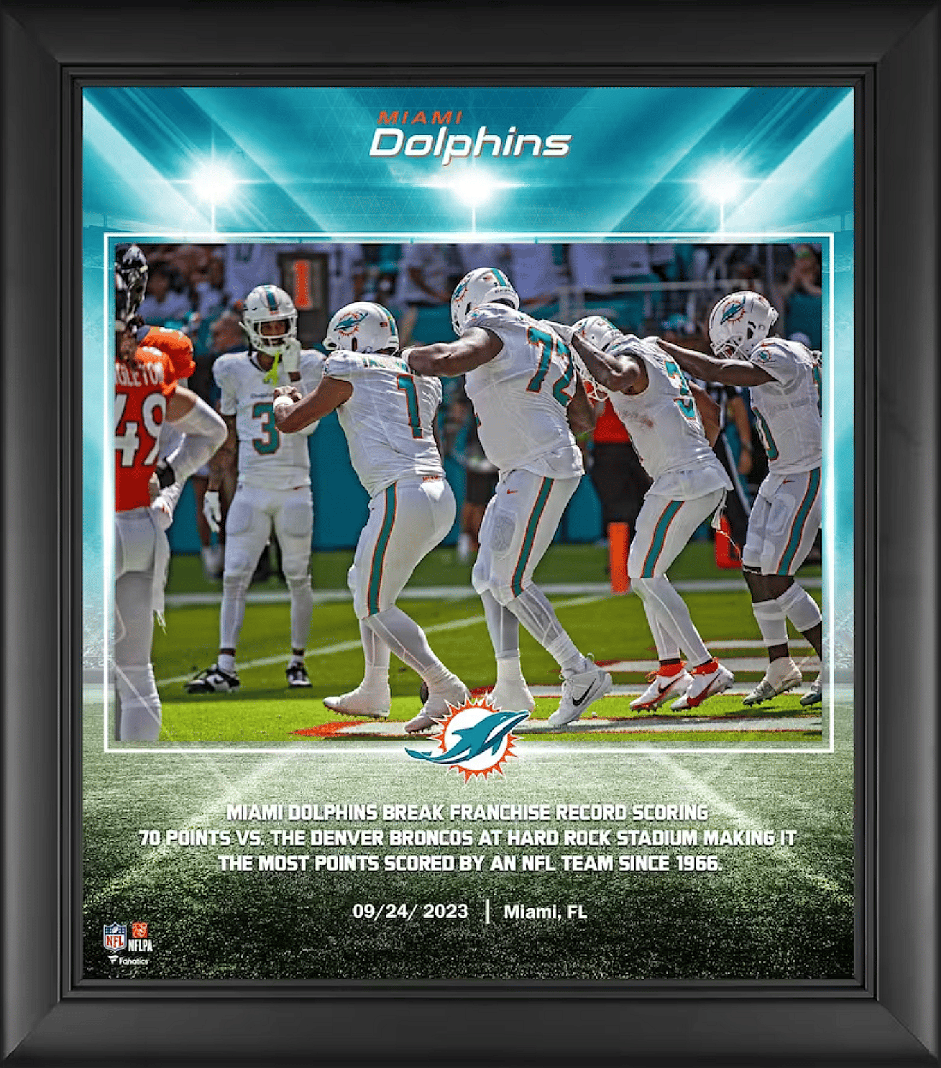 Do you remember where you were when the Dolphins scored seventy points against Denver? I was sitting in Met Life watching the Patriots vs. the Jets, watching the score climb on the jumbotron. If you want to keep those memories close by, get a framed photo of just one of the touchdown celebrations that record-breaking day.