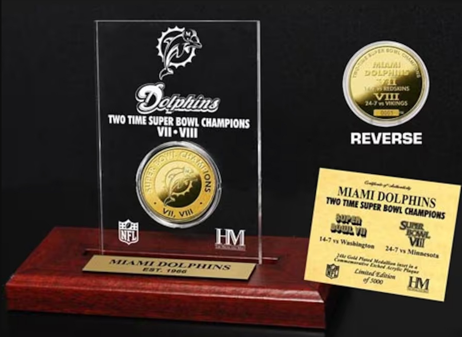 Even more valuable than the game coin is this two-time Super Bowl gold coin, with only 5,000 of them created. The 24k gold coin displays the two Super Bowls the Dolphins won — VII and VIII — along with the old logo that was used during that stretch in Miami’s history. If you enjoy the throwback logo better than the newer one, this could be a fun piece to add to your collection.