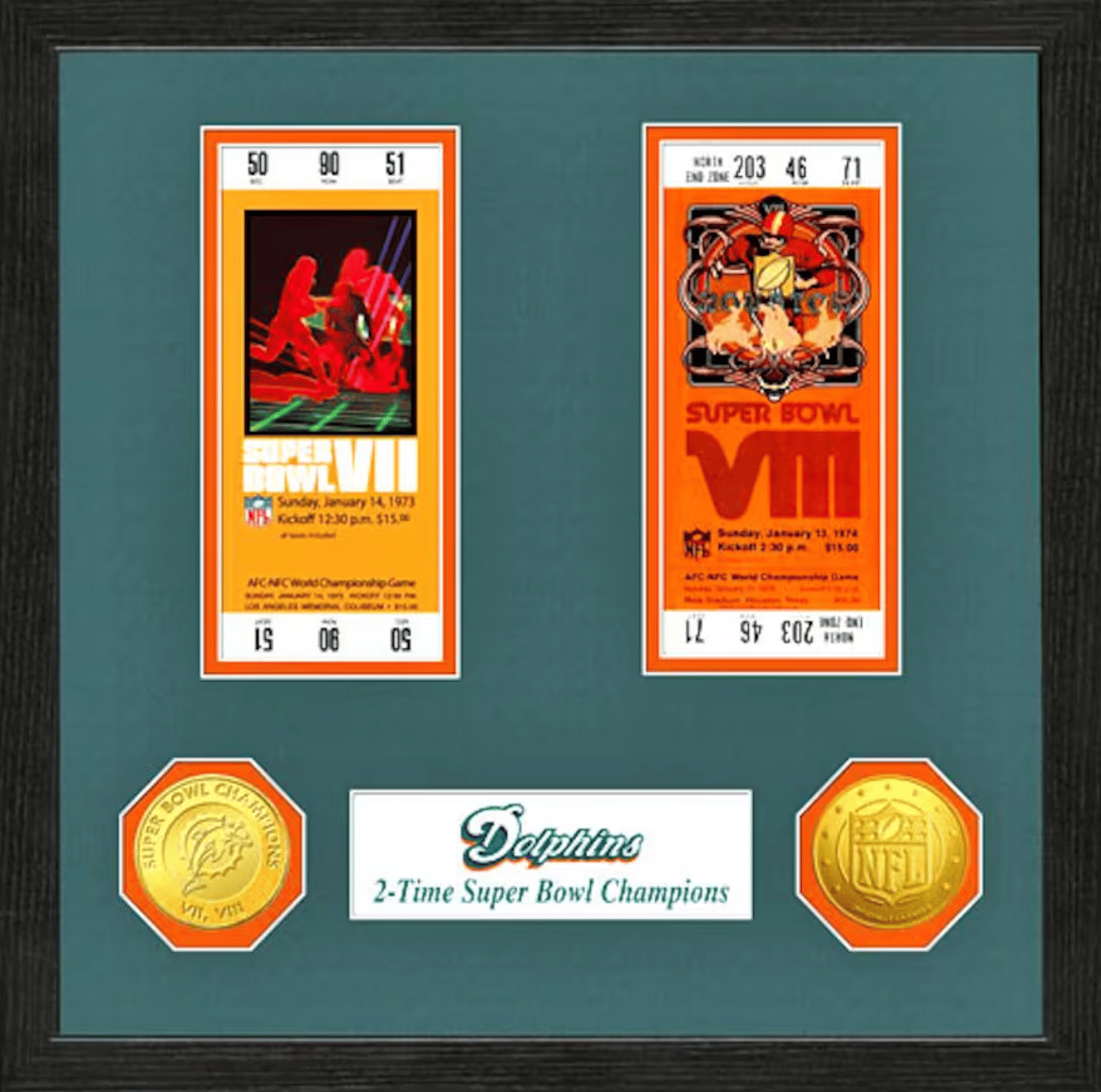 Similar to the gold coin highlighting Miami’s two Super Bowl wins, this framed piece displays the tickets from each game as the Dolphins became victorious. Hopefully, this season can add another ticket to this list, as the team is electric on and off the field, all led by Coach Mike McDaniel. This is such a cool Miami Dolphins collectible because it’s a piece of Dolphins’ history as well as NFL history.
