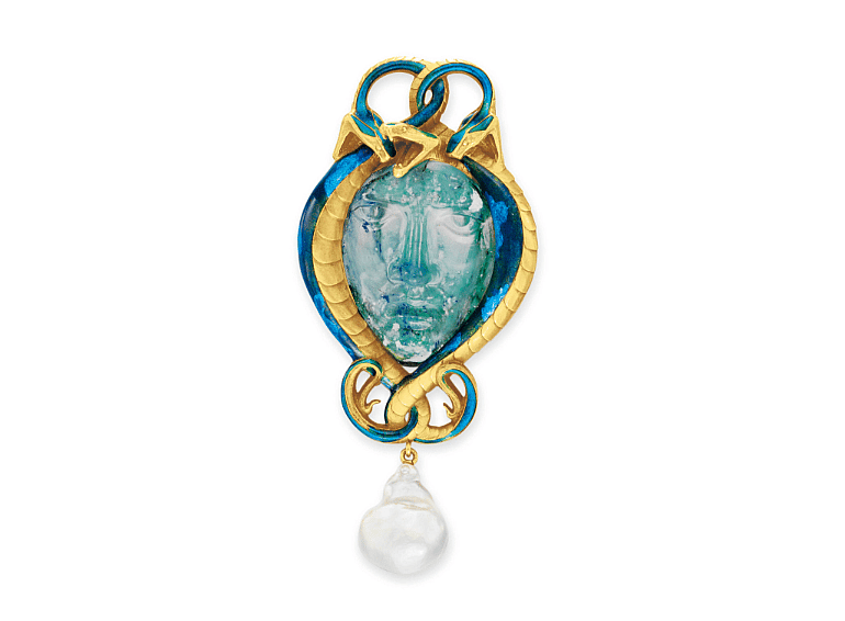 He often worked as a freelance artists, working under prestigious companies such as Cartier, Boucheron, and more. His brooch was made around 1910 and is designed with blue-green glass with Medusa’s face in the middle. Around the glass, there are textured and polished 18-carat gold serpents surrounding it, decorated with blue and green enamel. A baroque pearl is suspended underneath and is all mounted in 18-carat gold. It’s truly a beautiful accessory for any outfit.