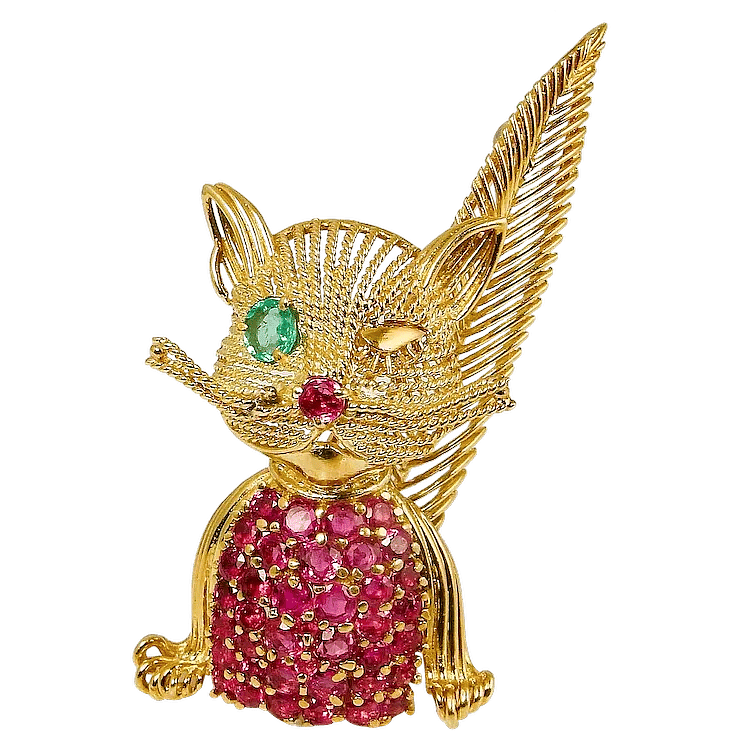 Coming from the 1950s is our fourth selection, the Mid-Century Cat Brooch. Made up of 18k yellow gold, the body is embellished with stunning rubies while the eye is made of a round-cut natural emerald. The jewels add up to 7.85 carats, pushing this brooch to $8,600.