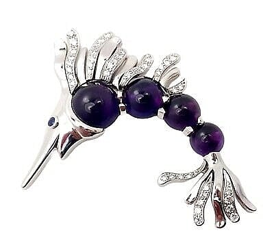 Our fifth antique brooch is the Chanel Miami Marlin Fish brooch. Though there is not a specific origin date etched into the brooch, it is believed to be from before the 2000s. On the brooch, “Chanel 750” is etched into the back and the fish is adorned with four amethysts and one blue sapphire. With other small diamonds embellishing the fins, the price tag jumps to around $8,300.