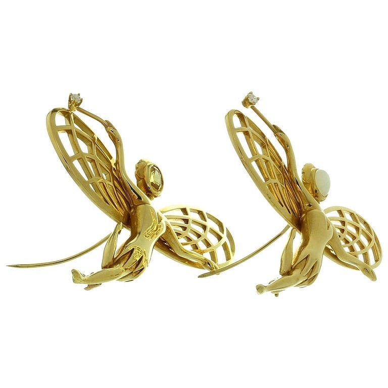 Our second most valuable brooch is made by Van Cleef & Arpels, one of the most reputed jewelry houses in the world. This piece features two dancing fairies as a brooch pair, one with an oval-cut moonstone face and the other with a yellow-sapphire face. Made of yellow gold and adorned with small diamonds, the value of this brooch skyrockets to $45,000.