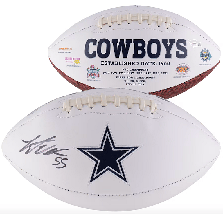 Leighton Vander Esch is a current linebacker for the Dallas Cowboys, joining the roster in 2018. Add this offensive player’s signature to your most valuable Dallas Cowboys collection with a white paneled football, complete with signature and logo. This football is certified as authentic, so you can show off to your friends without any doubt of it being a fake.