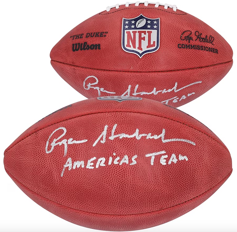 7. Roger Staubach Autographed Duke Full Color Football with “America’s Team” Inscription, $500