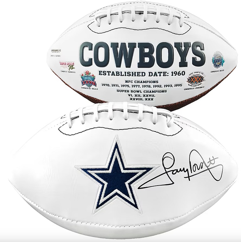 Roger Staubach is known as one of the best quarterbacks for the Dallas Cowboys, and had several nicknames including “Rodger the Dodger” and “Captain Comeback.” Staubach played for eleven seasons from 1969 to 1980, and was inducted into the Pro Football Hall of Fame in 1985. A signed ball from Staubach himself would be the Holy Grail addition to your Cowboys collection.