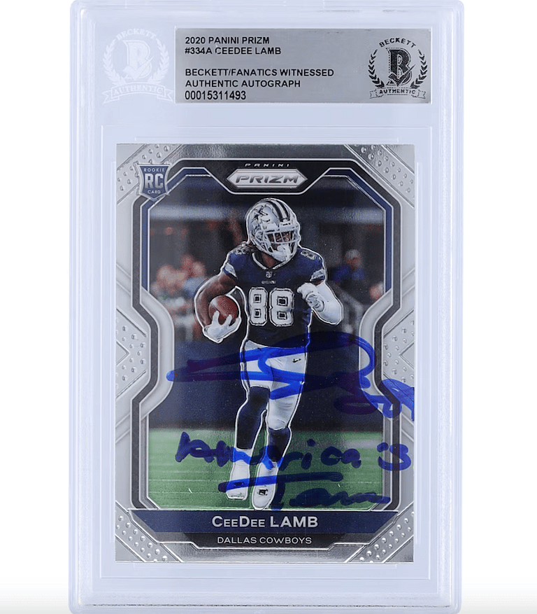 12. CeeDee Lamb Autographed 2020 Panini Prizm #334 Authenticated Rookie Card with “America’s Team” Inscription, $250