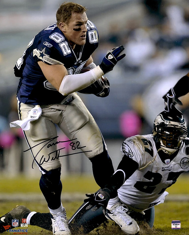 Formally a tight end for the NFL, Witten primarily played for the Dallas Cowboys over his seventeen season run. During his career he became one of the top tight ends in the NFL, so it makes sense that his signature would appear on our most valuable Dallas Cowboys collectibles list. In this specific photo Witten has no helmet and is rushing forward while playing the Philadelphia Eagles.