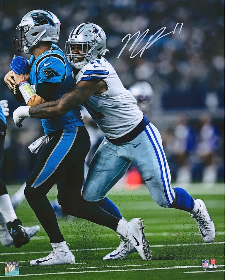 Micah Parsons is a defensive linebacker for the Dallas Cowboys, and even though he only joined the Cowboys in 2021, he is a huge piece of their defense. This is shown in the above signed photo of him going in for a tackle on the quarterback of the Carolina Panthers. Add this photo to your collection and show your support for the defensive side of the Cowboys.