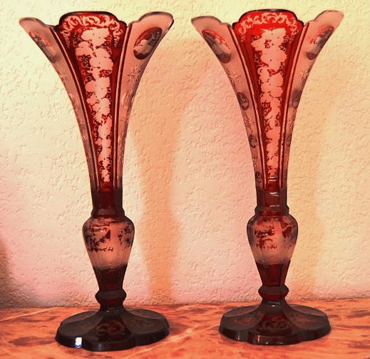 1. Antique Bohemian Ruby Red Engraved Art Glass Vases, $45,000