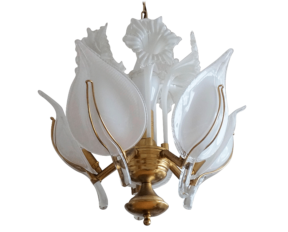 This hand-blown chandelier sold for over $3,000 on 1st Dibs. It features white Murano glass calla lilies and leaf shades with gold plated brass structure for a beautiful light effect. The light was made by Franco Luce, who commonly created light fixtures that are elegant with floral designs. This one in particular was made in the 1960s in Italy and is an impressive creation.