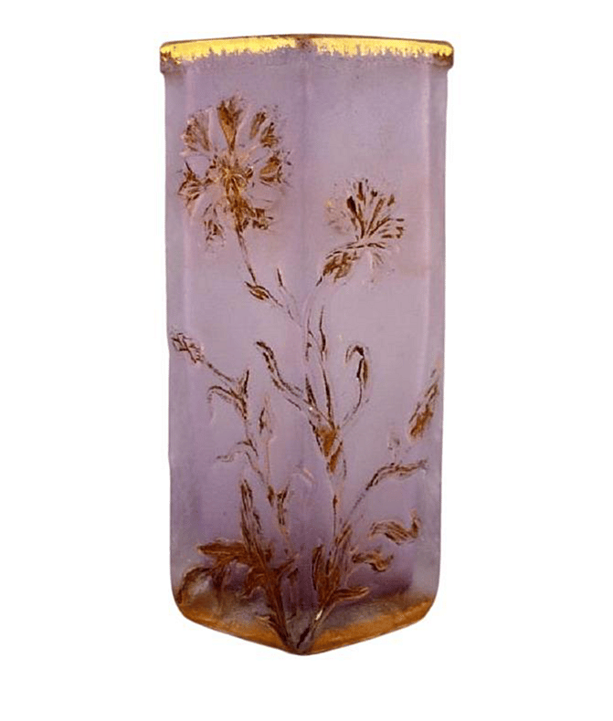 Daum Nancy antique glass is credited to Auguste and Antonin Daum, the brothers who took over a glass factory that was owned by their father in France during the 1870s. They began their journey with watch crystals and utilitarian glassware until they began experimenting with art glass. One of their many products was the pink mouth-blown vase with decorated flowers and gold decorations. It was made in the early 20th century during the Art Nouveau era when experimenting with glass was common.