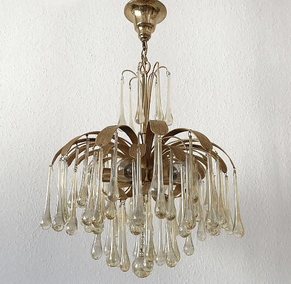 This rare and stunning find is a mid-century Tear Drop and Leaf chandelier featuring 6-lights from the 1970s. Manufactured by Palway in Germany, this chandelier is worth around $2,500 on secondary marketplaces like eBay and Etsy. The teardrops surrounding the light bulbs create a beautiful effect when lit, and is an elegant addition to any space.