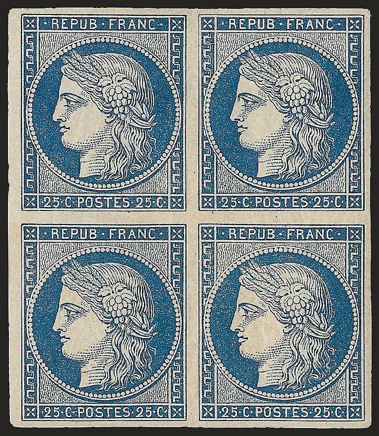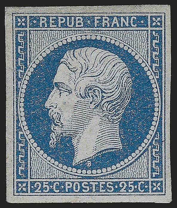 The blue 25-centimes stamp was in use from July 1850 to September 1852. Since the second plate of stamps was not placed in use until 4.3 million stamps had been printed, only about 136 thousand tete-beche pairs survived, but only two unused ones remain to this day. One of these pairs was in the Ferrary collection until they were sold for $72,500 in 2010.