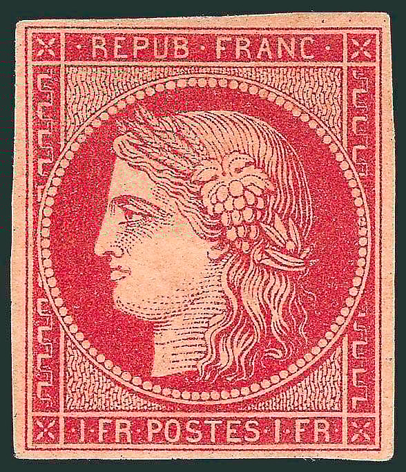 The rarest French stamp in the world is the 1 Fr Light Carmine from 1849. It sold at auction in very fine condition for $190,000 by Robert A. Seigel in 2010. This particular stamp is regarded as one of the greatest 1849-1850 Ceres issues ever, featuring the Roman goddess of growing plants.